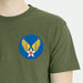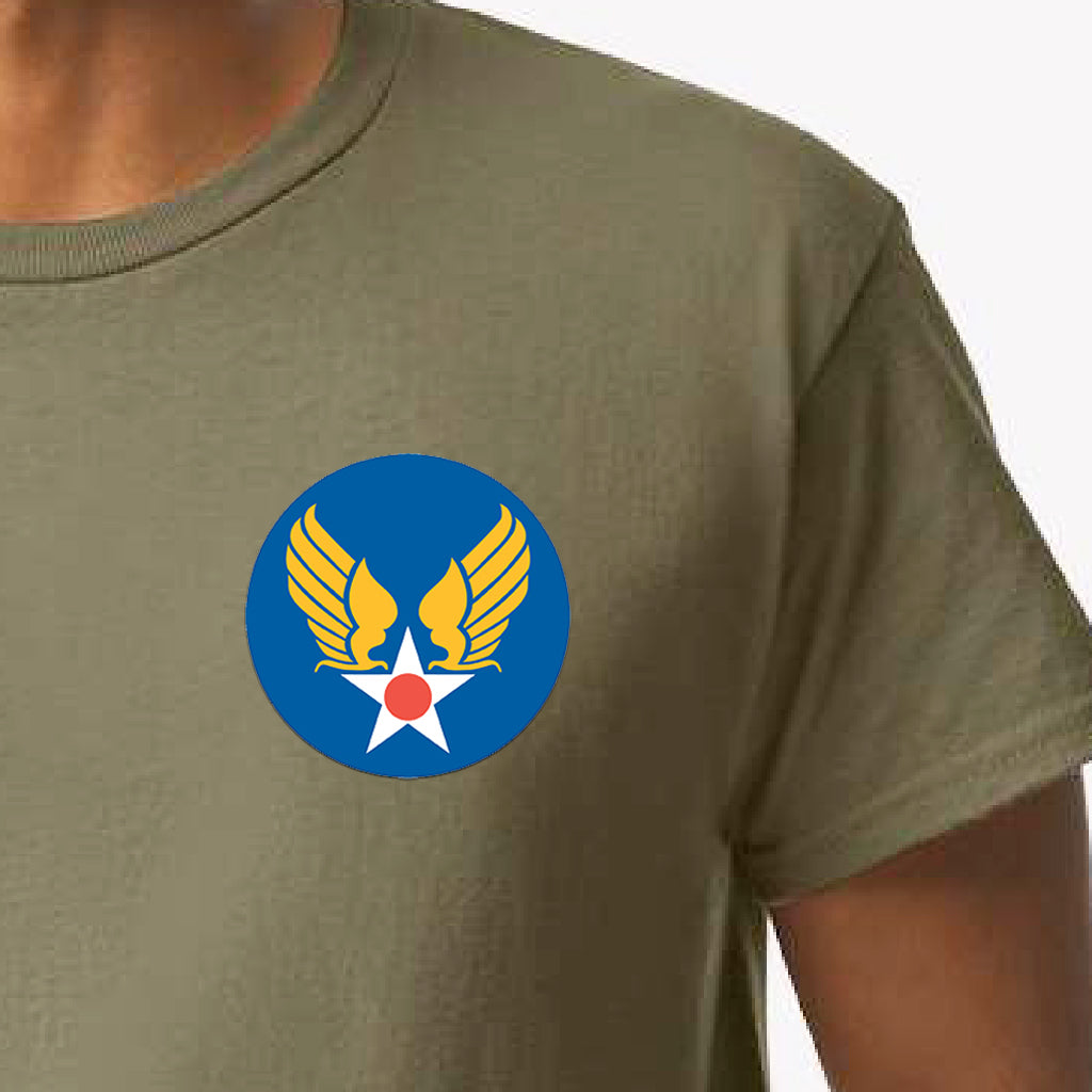 4" wide Army Air Corps symbol, also known as the Hap Arnold wings printed on Left Chest with Reverse USA Flag on Right Shoulder/Sleeve.